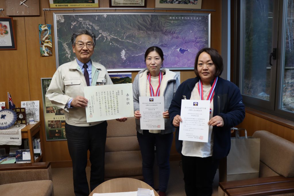 2025年12月7日(日)に東京都(女子栄養大学)にて開催された第20回全国学校給食甲子園決勝大会で全国の各ブロックから決勝に勝ち進んだ12の代表による最終審査が行われ、南相木小学校が“優秀賞”を受賞しました。大会翌日の12月8日(月)には、出場された栄養教諭の飯島芙未先生、調理員の中島里美さんが中島則保村長に大会の結果報告を行いました。出場された二人からは、これを励みに毎日の給食を更に充実させ、健康的でおいしい給食作りにつなげていきたいと語っていました。